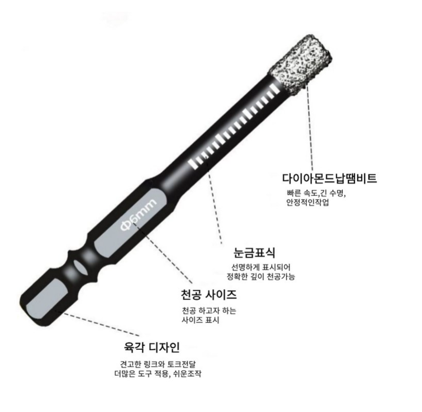 쿨링 오일이 내장되어 있어 열 발생을 줄여줍니다. 타일을 천공할 때 발생하는 열로 인해 비트가