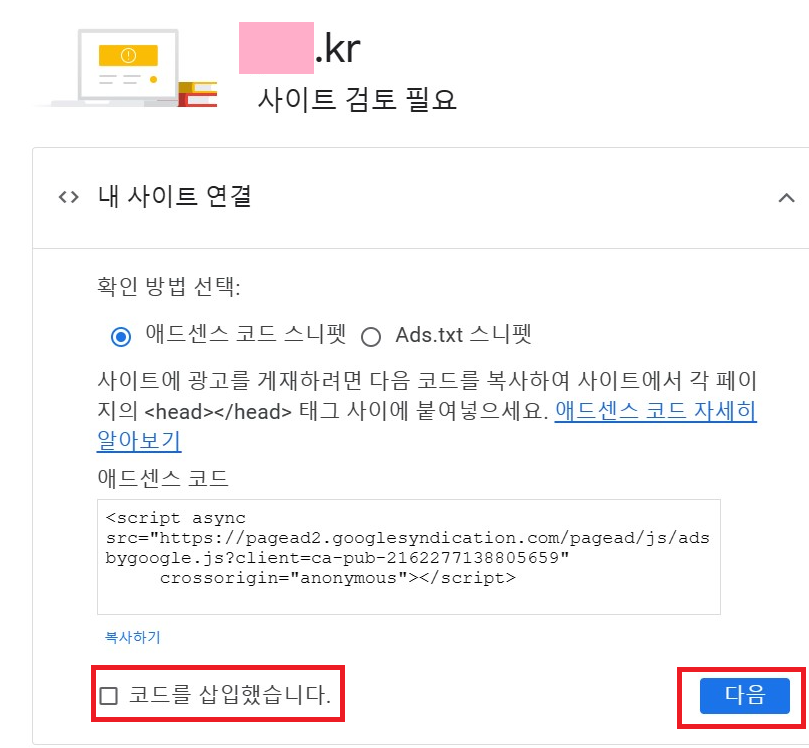시작하기를 누른 후에 내 사이트 연결에서 애드센스 코드를 복사해서 개인 도메인에 붙여넣으라고 하는데 4.2에서 자동광고를 ON으로 했기 때문에 그냥 코드를 삽입했습니다를 클릭하고 다음을 눌렀습니다. 그리고 검토 요청을 누르면 끝이에요.