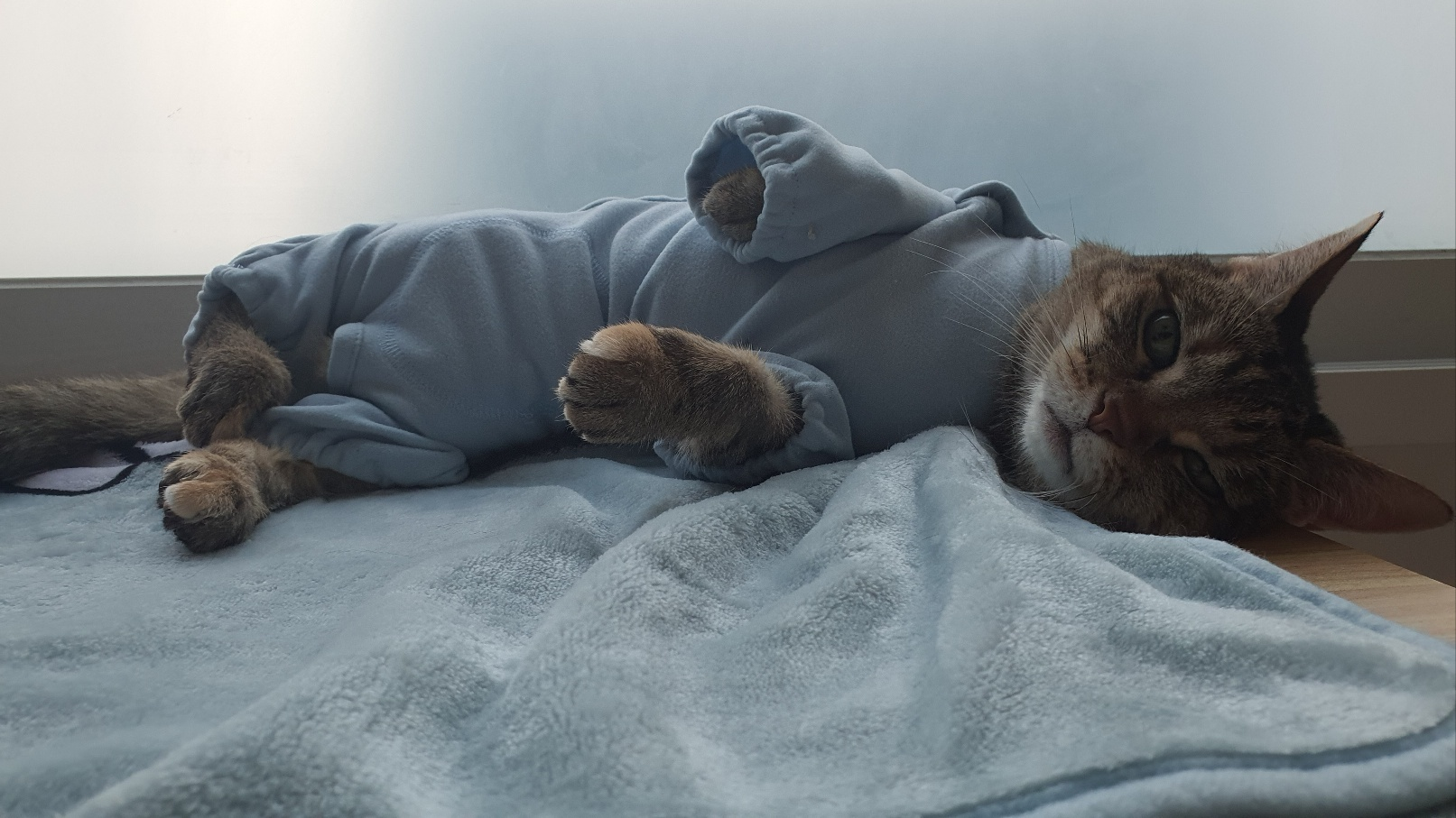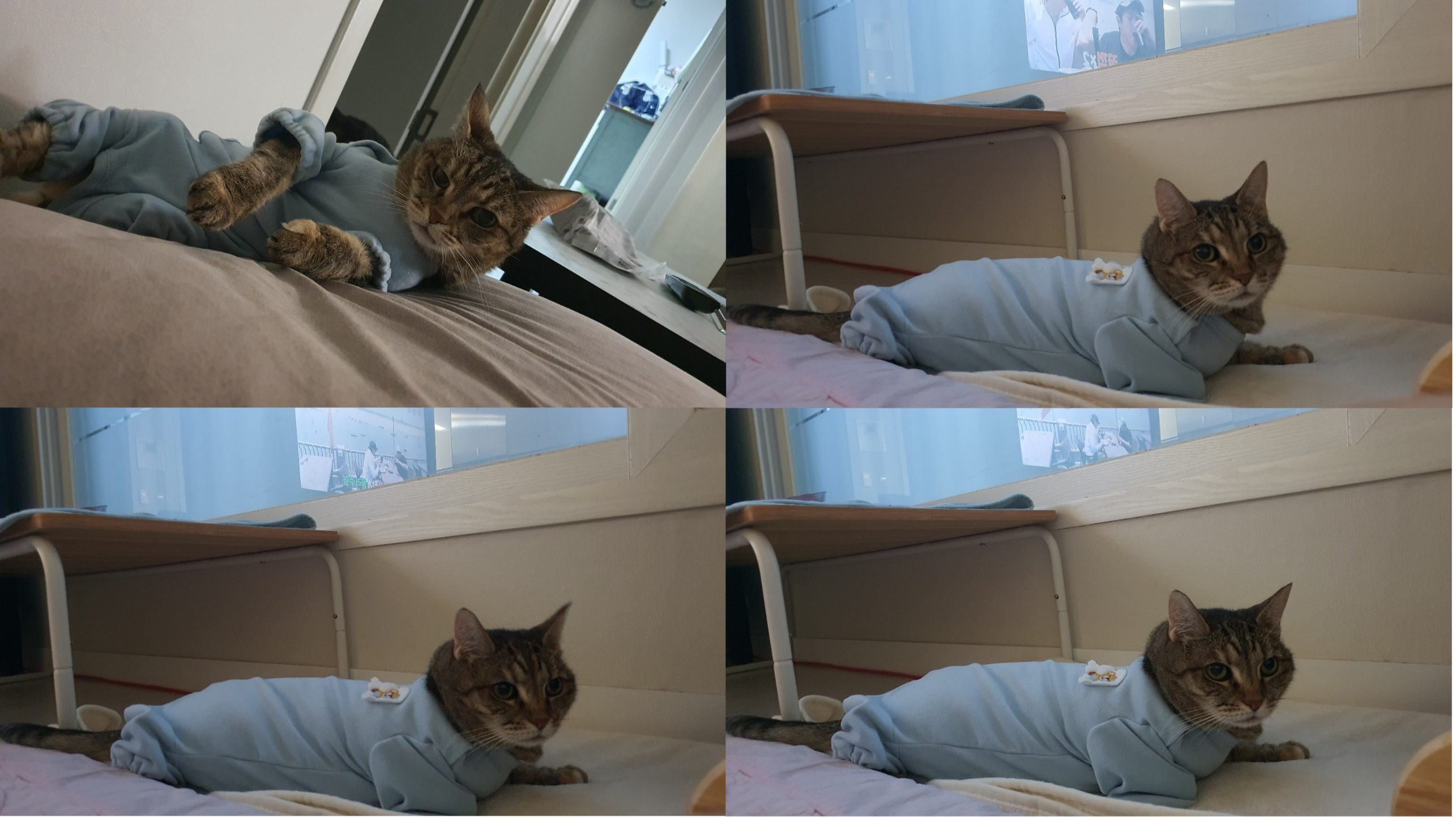 고양이 옷을 입히면 처음에는 고장 나지만 반나절 정도 있으면 적응을 한다고 하던데 정말 묘마다 다른가보다. 우리애는 반나절이 지나도 고장났고, 둘째냥이가 옆에 오니 하앜질을 했으며, 한두걸음에 벌러덩 뒤집어졌다.