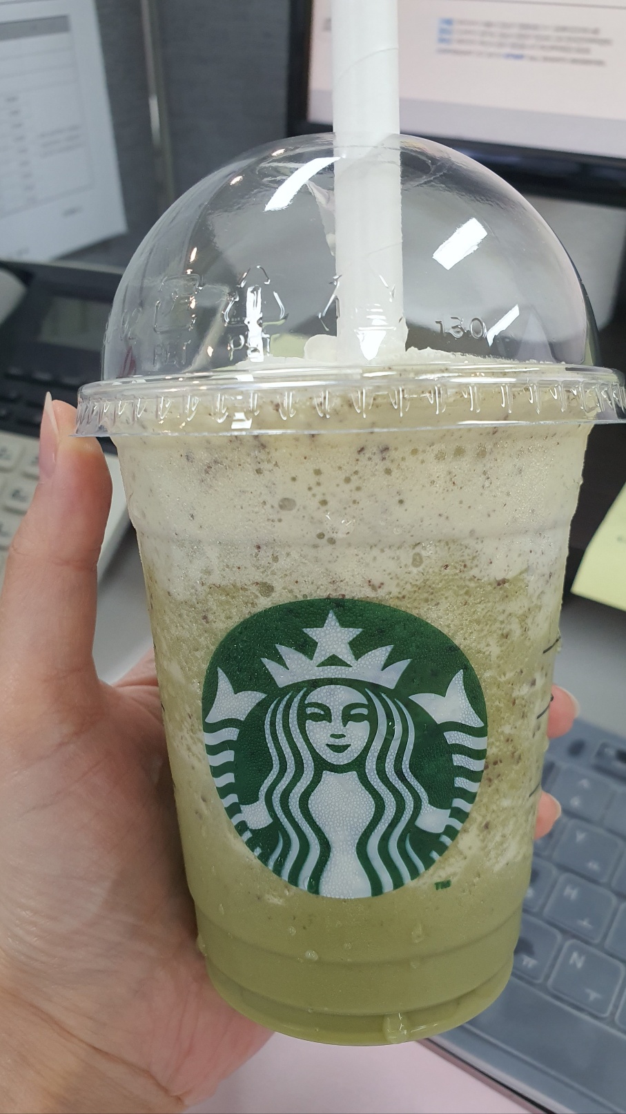 거래처에서 우리 회식한다는 얘기를 듣고 스타벅스 커피 한잔씩들 하라고 보내준 걸로 스벅 제주 유기농 말차로 만든 크림 프라푸치노 한잔했는데 나는 진짜 좀 진상이다ㅋㅋㅋㅋ 첨에는 그냥 커피인줄 알고 아아 했다가 스벅이란 말 듣고 따뜻한 라떼 디카페인에 우유 대신 두유로 변경 했다가 말차라떼 보고선 말차라떼 를 골랐는데 거기에 샷추가 도 하고 다른직원이 자바칩 추가한거 보고 자바칩 추가를 외쳤다.