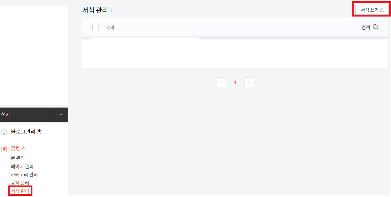 5. 티스토리 블로그 관리로 와서 서식관리 -> 서식쓰기 순으로 클릭 하고 아까 메모장에 복사해둔 본 본문에 넣자를 붙여넣기 한 후에 완료를 눌러줍니다. 완료 후 서식관리에 저장한 서식이 보이면 이 단계는 완료된 것이다.