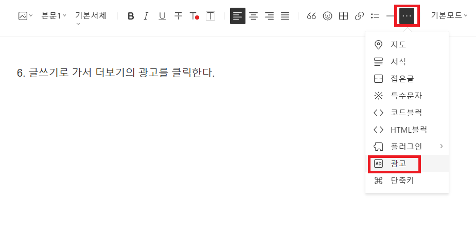 6. 글쓰기로 가서 더보기의 광고를 클릭하면 광고 팝업이 뜨는데 이 때 애드센스로 되어있는 것을 확인 하고 확인을 누르면 된다.