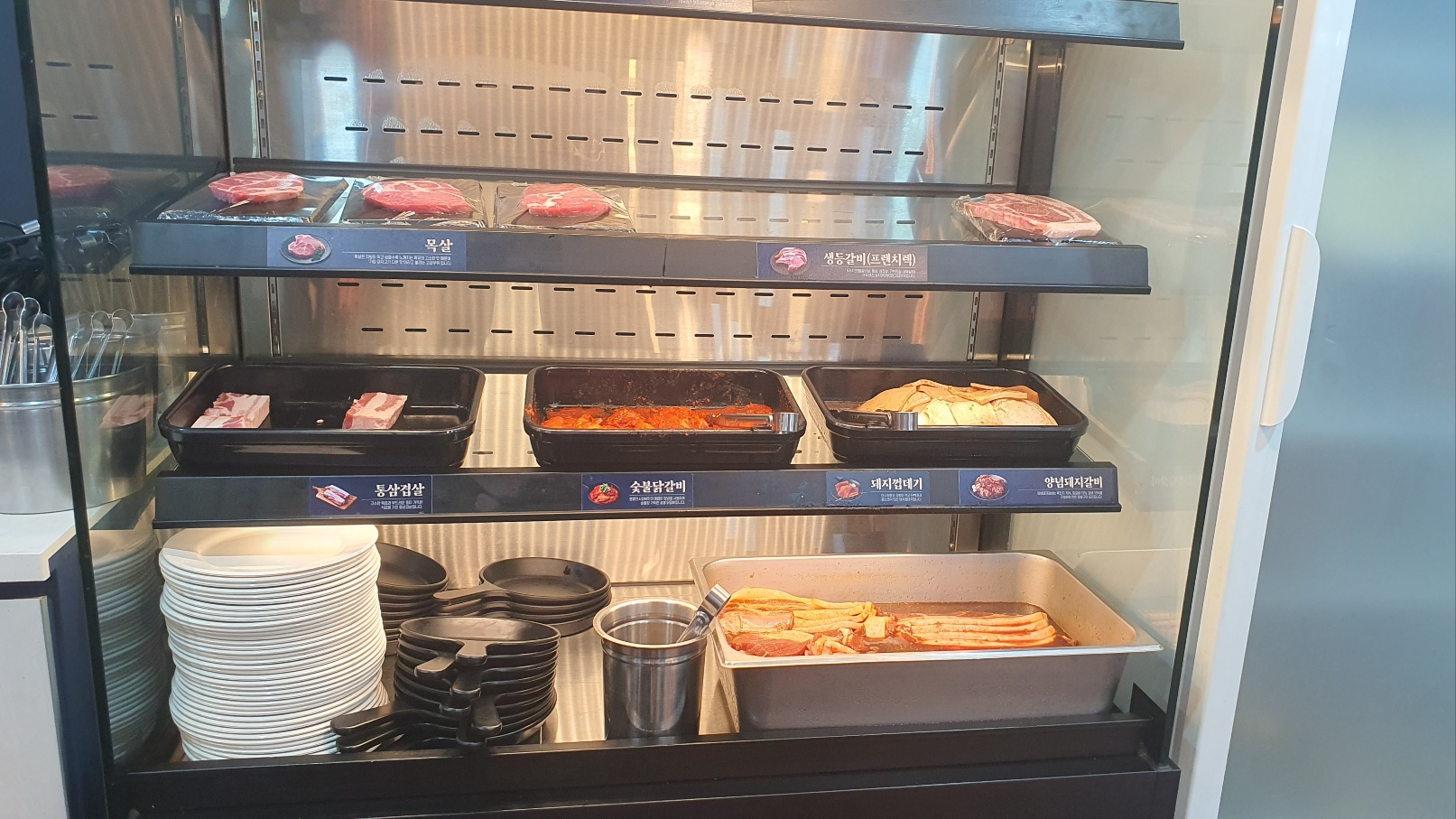 들어가서 보니 뭐가 많이 바뀌긴 한것 같은데 하도 간지가 오래되서 기억이 잘 안나서 그런지 그닥 감흥은 없었다. 뷔페처럼 스낵류들이 차려져 있었는데 모닝빵 하나만 챙기고 다른 튀김, 잡채 등은 손은 안댔다. 잡채를 퍼가긴 했는데 손도 안내고 다 남긴... 이럴거면 음식 아깝게 담질 말걸 그랬다. 무한리필집에 갔으면 고기만 먹어야지 사이드는 먹어봐야 돈이 아깝다는 주의라 앉자마자 기본 찬들 셋팅을 하고 고기부터 가져왔다.