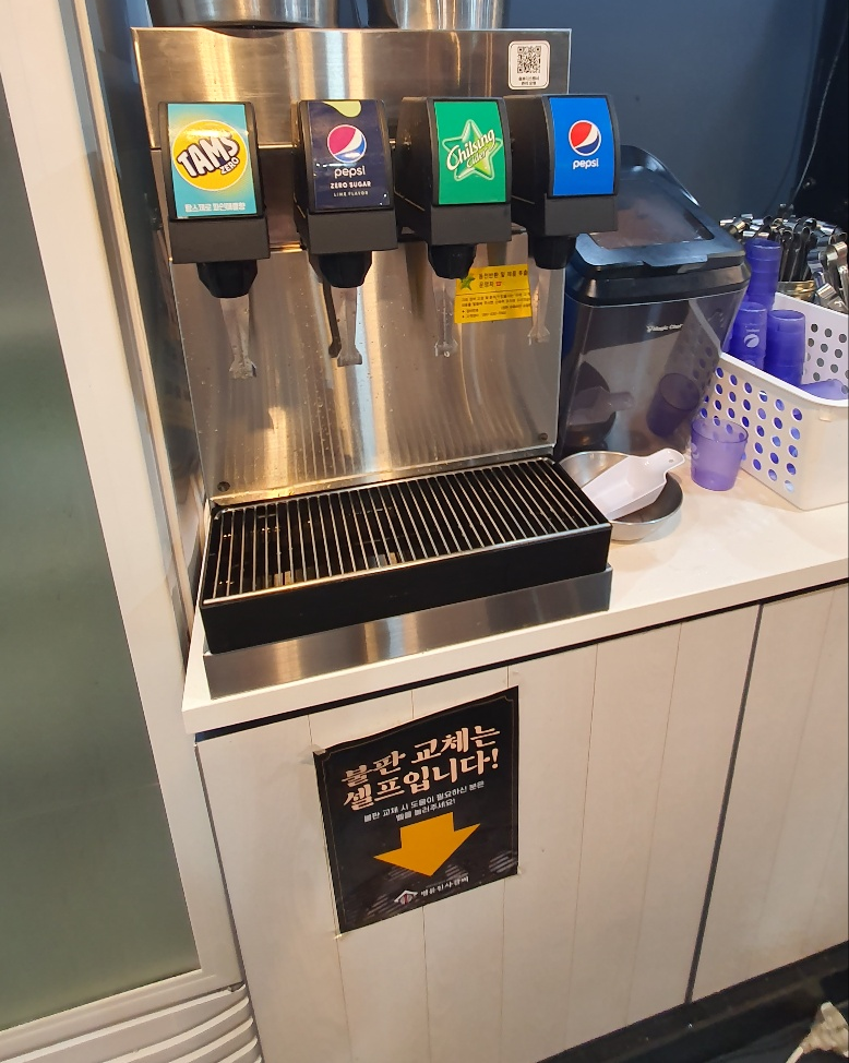 나는 저 음료 밑에 붙어 있던 "불판 교체는 셀프입니다!" 라는 걸 못보고 계속 불판을 바꿔 달라 했는데 별 말 없이 다 교체 해 주시고 마지막에 주인인 것 같은 아저씨가 불판 교체 하면서 원래는 셀프라고 말해 주셔서 알았다.