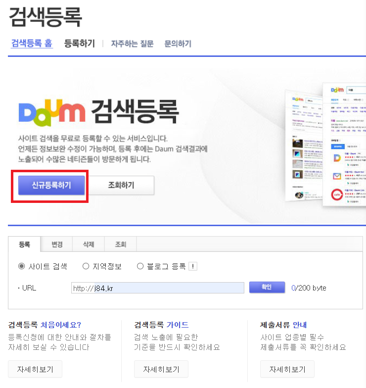 Daum 검색등록 사이트 검색을 무료로 등록할 수 있는 서비스입니다. 언제든 정보보완 수정이 가능하며, 등록 후에는 Daum 검색결과에 노출되어 수많은 네티즌들이 방문하게 됩니다. 신규등록하기