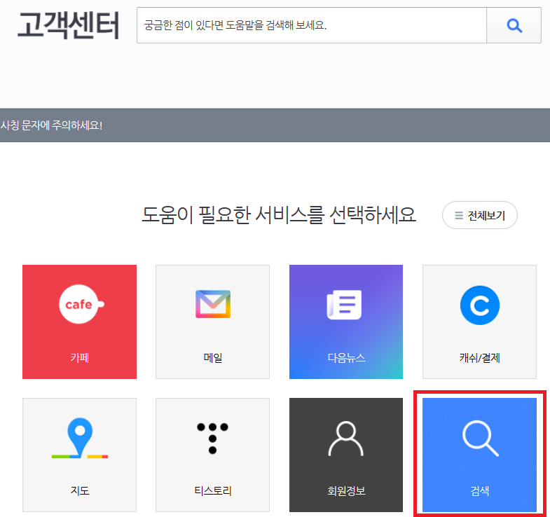 다음 사이트에서 고객센터 검색 후에 검색 -> 검색결과 미노출 -> 문의하기 순으로 클릭하여 글을 작성하는데 검색이 안되는 상태 사진을 캡쳐해서 첨부파일로 보내도 좋다.