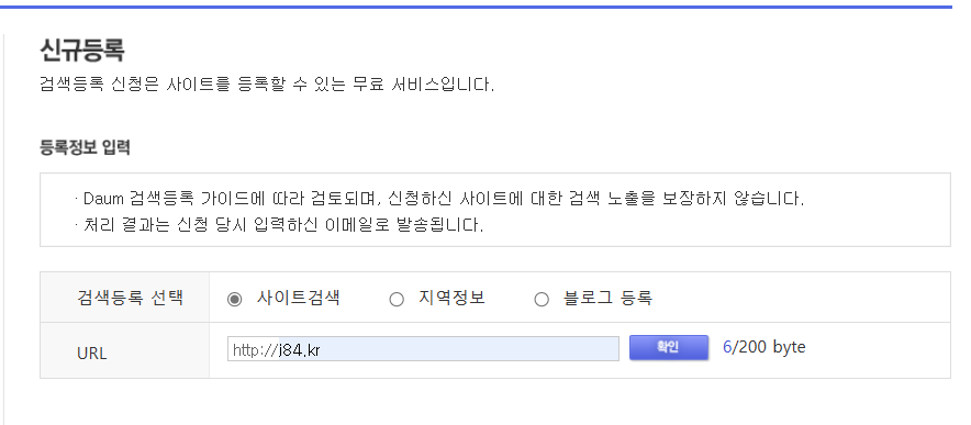 Daum 검색등록 사이트 검색을 무료로 등록할 수 있는 서비스입니다. 언제든 정보보완 수정이 가능하며, 등록 후에는 Daum 검색결과에 노출되어 수많은 네티즌들이 방문하게 됩니다. 신규등록하기