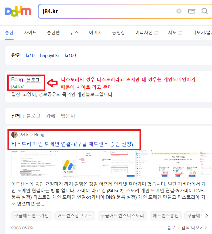 현재 나는 최적화 상태 이기 때문에 사이트와 블로그 검색 둘 다 확인 된다.