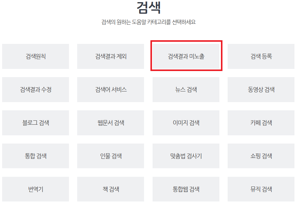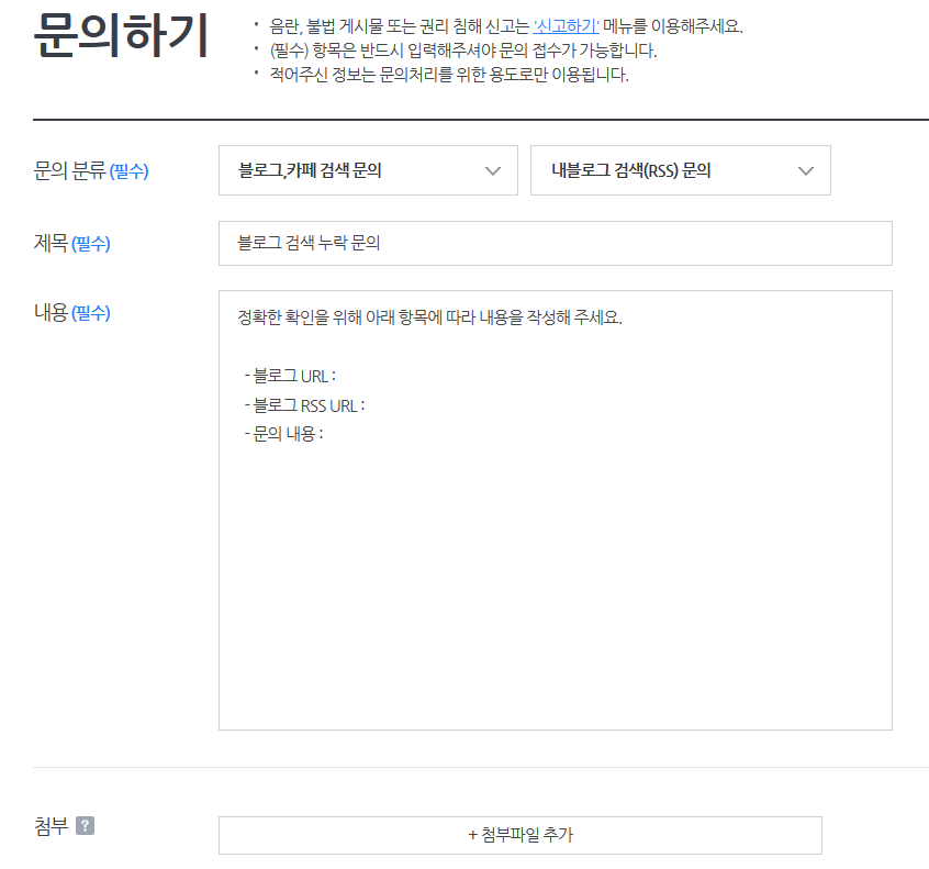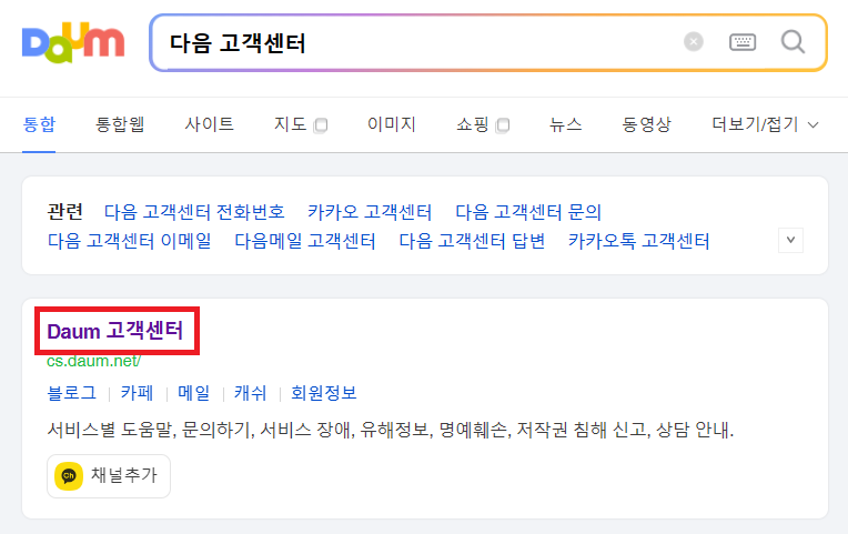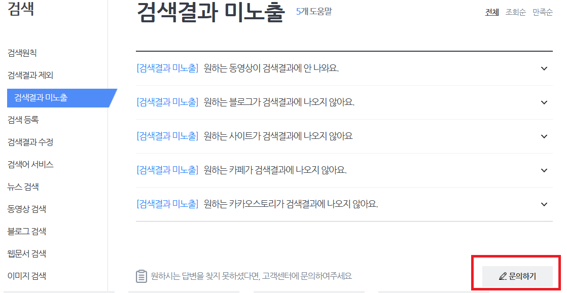 다음 사이트에서 고객센터 검색 후에 검색 -> 검색결과 미노출 -> 문의하기 순으로 클릭하여 글을 작성하는데 검색이 안되는 상태 사진을 캡쳐해서 첨부파일로 보내도 좋다.