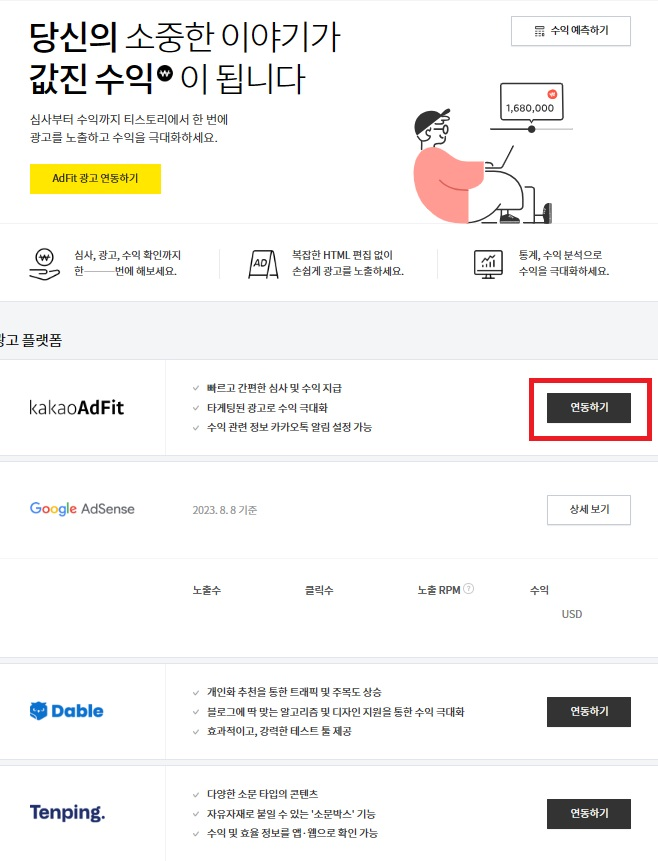블로그 관리에서 수익을 클릭 하면 내가 연동할 수 있는 4개의 광고 플랫폼이 나옵니다.