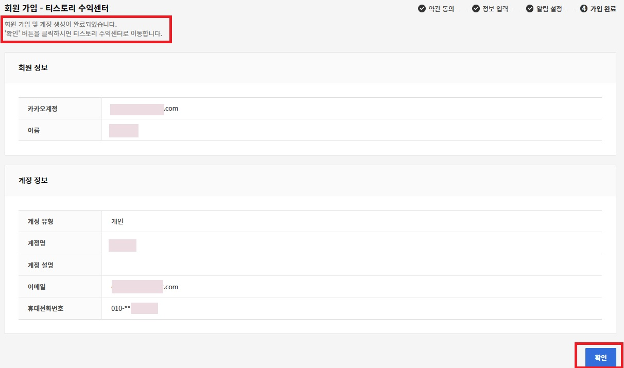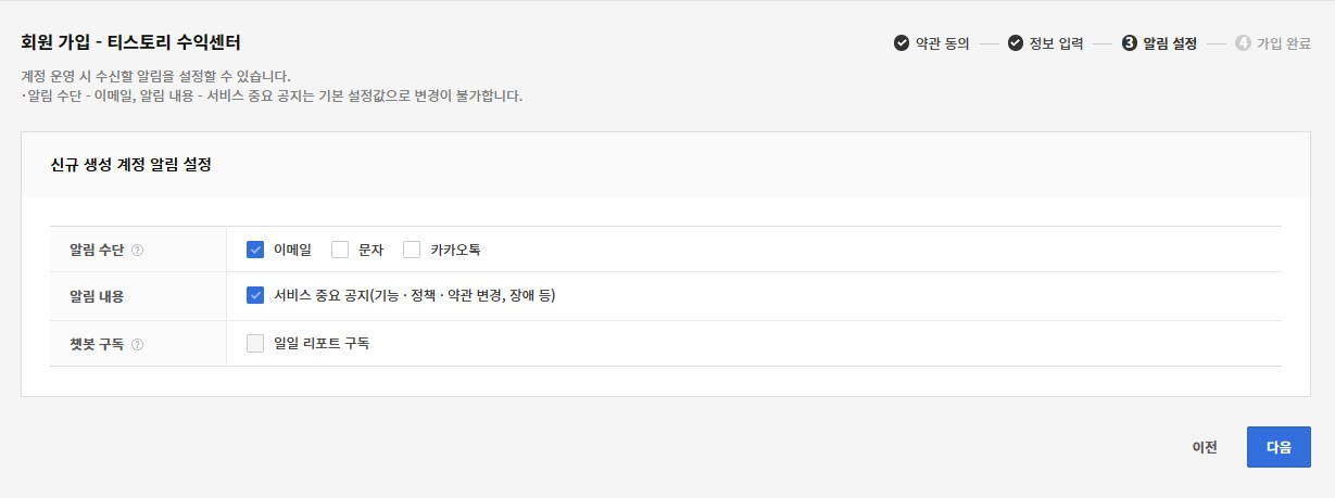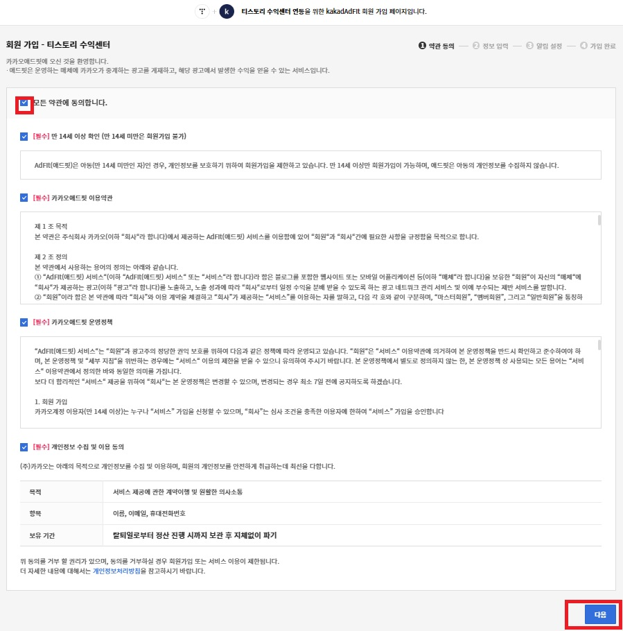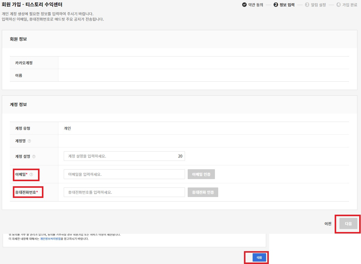 3. 카카오계정 로그인을 했으면 아래 순서대로 약관동의 -> 개인정보 입력 -> 알림 설정 을 합니다.