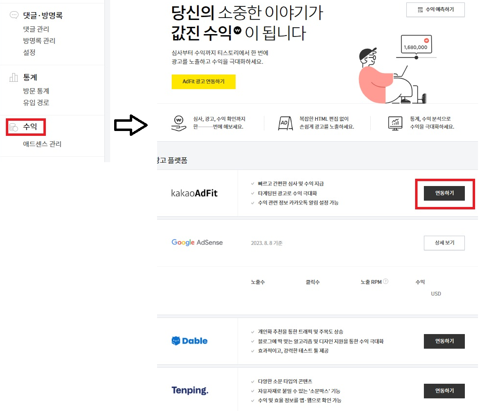 블로그 관리에서 수익을 클릭 하면 내가 연동할 수 있는 4개의 광고 플랫폼이 나옵니다.