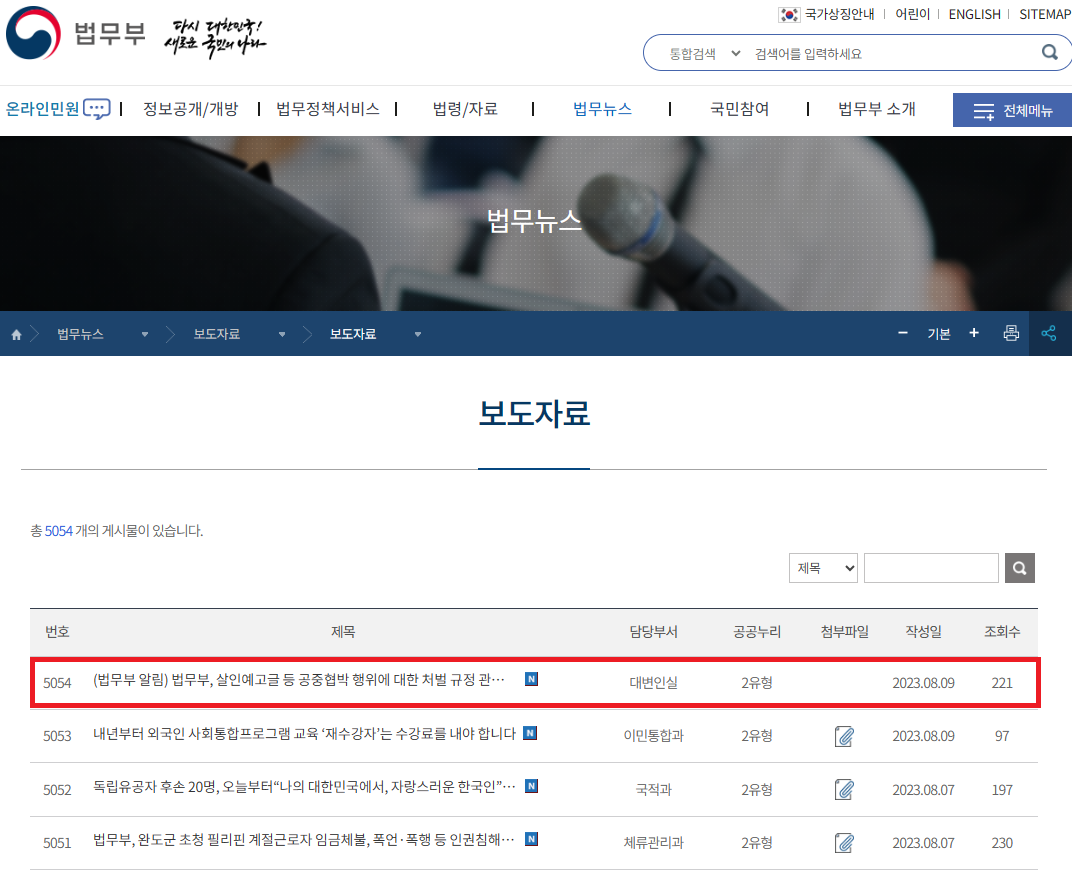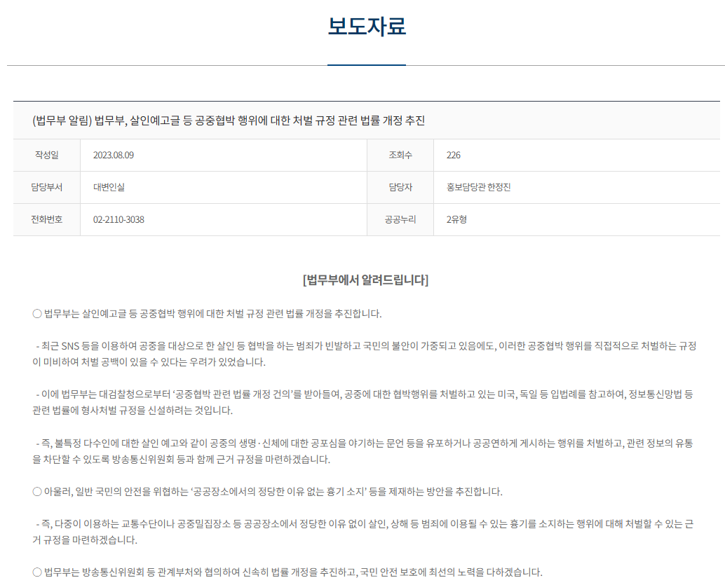 법무부에서 살인예고글 등 공중협박 행위에 대한 처벌 규정 관련 법률 개정을 추진한다고 밝혔다.
