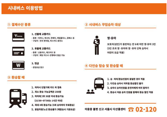 자세한 조정 내역은 시내·마을버스 차량 및 정류장에 부착된 안내문이나, 서울시 누리집(분야별 정보 – 교통 - 교통 요금 안내) 에서도 확인할 수 있다고 하며 유선 문의를 희망하는 경우 다산콜센터(02-120)로 확인하거나, 이용 내역 및 부과요금에 대한 상세 문의는 티머니 고객센터 (1644-0088)에서 가능하다.