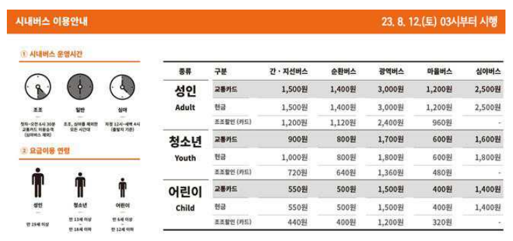 8월 12일부터 시내버스와 마을버스 기본 요금이 300원 인상 되고 심야버스는 350원, 마을버스는 700원이 인상이 된다고한다.