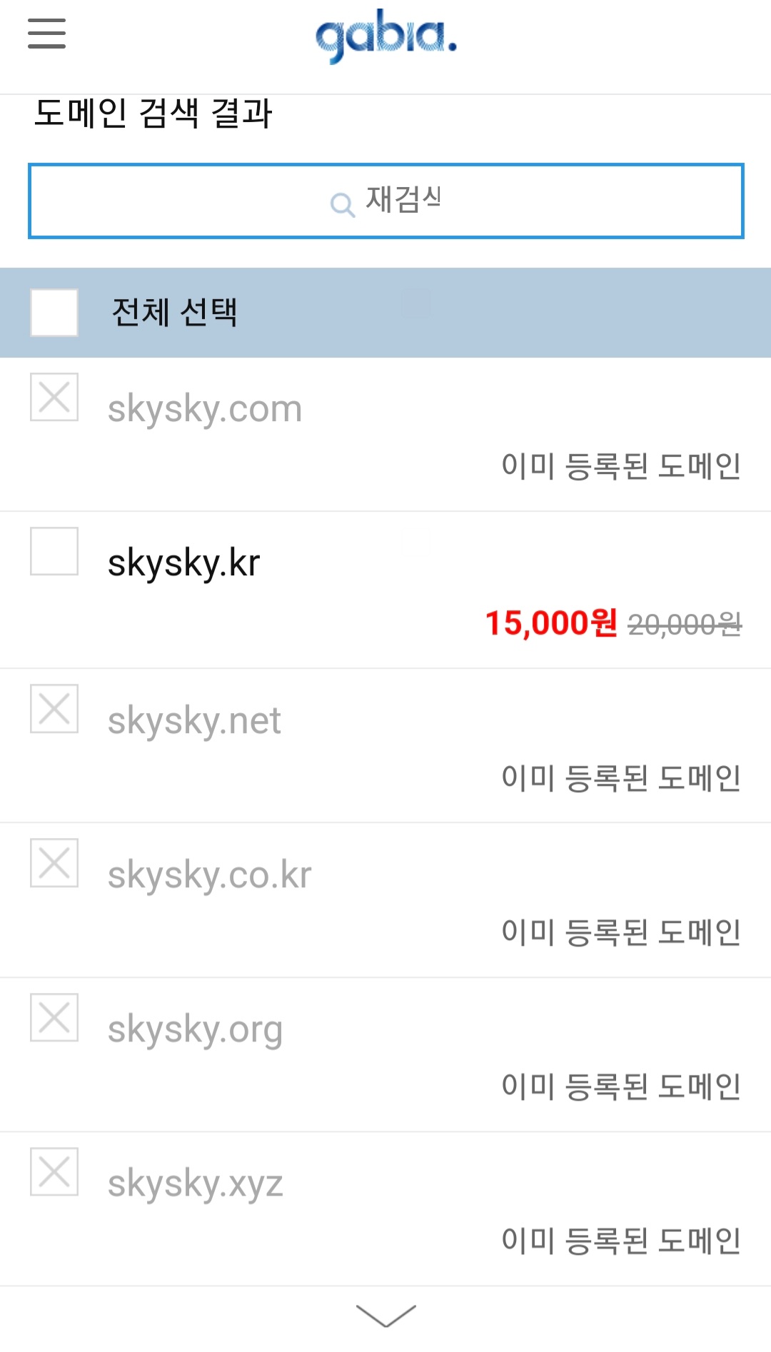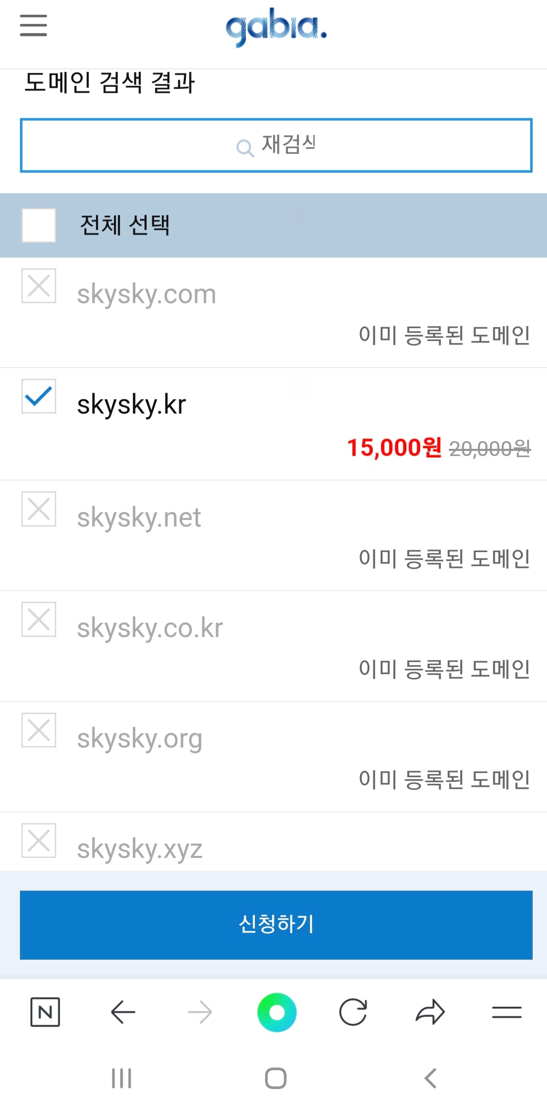 skysky 라는 이름으로 검색을 했는데 대부분이 이미 사용중이라 재검색으로 다른 도메인 주소 검색을 해도 되고 가능한 주소를 클릭한 후에 신청하기를 눌러도 됩니다.
