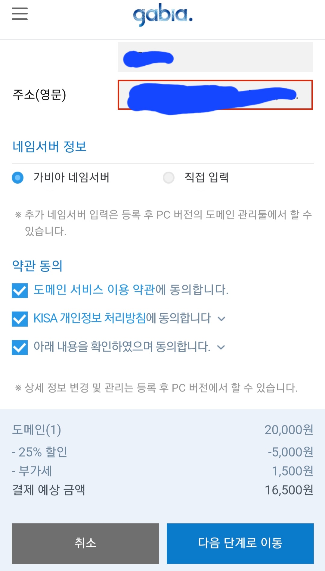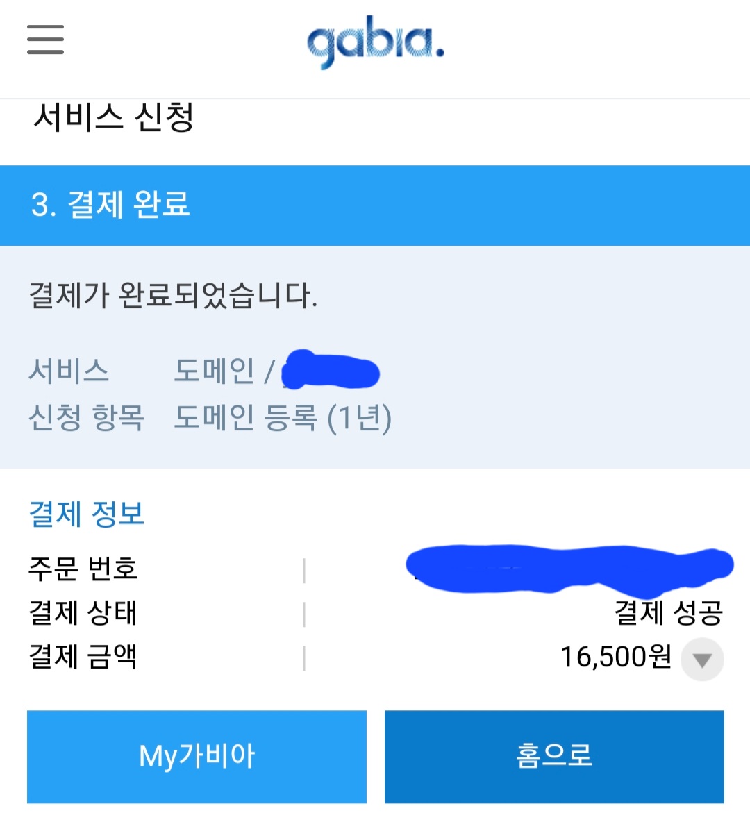 최종목적인 애드센스 승인을 받기위한 과정 중 가비아에서 개인도메인 주소를 생성 하는 첫번째 단계가 끝났습니다.