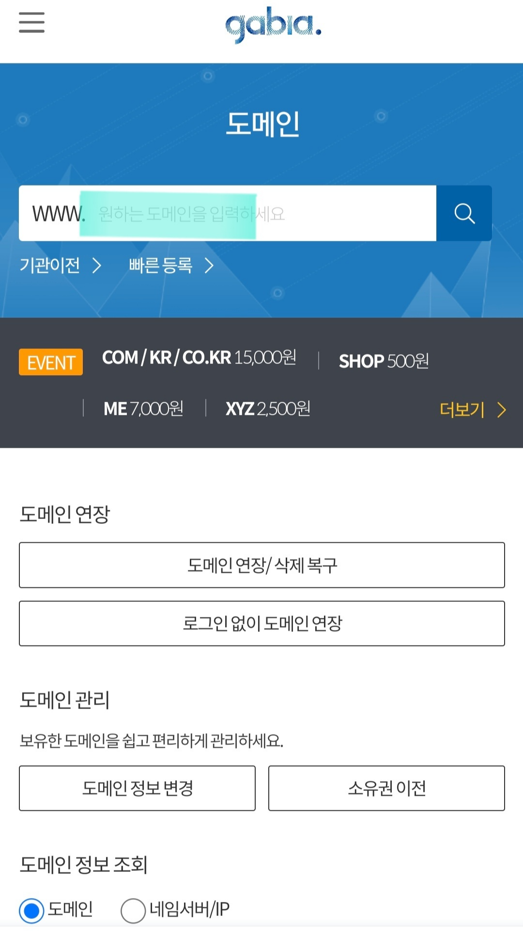 모바일로 나오는 페이지에 원하는 도메인 주소를 검색을 할 수 있는데 대부분의 쉽고 짧은 도메인들은 이미 선점되어있어서 원하는 도메인 주소를 얻지 못할 수 있습니다.