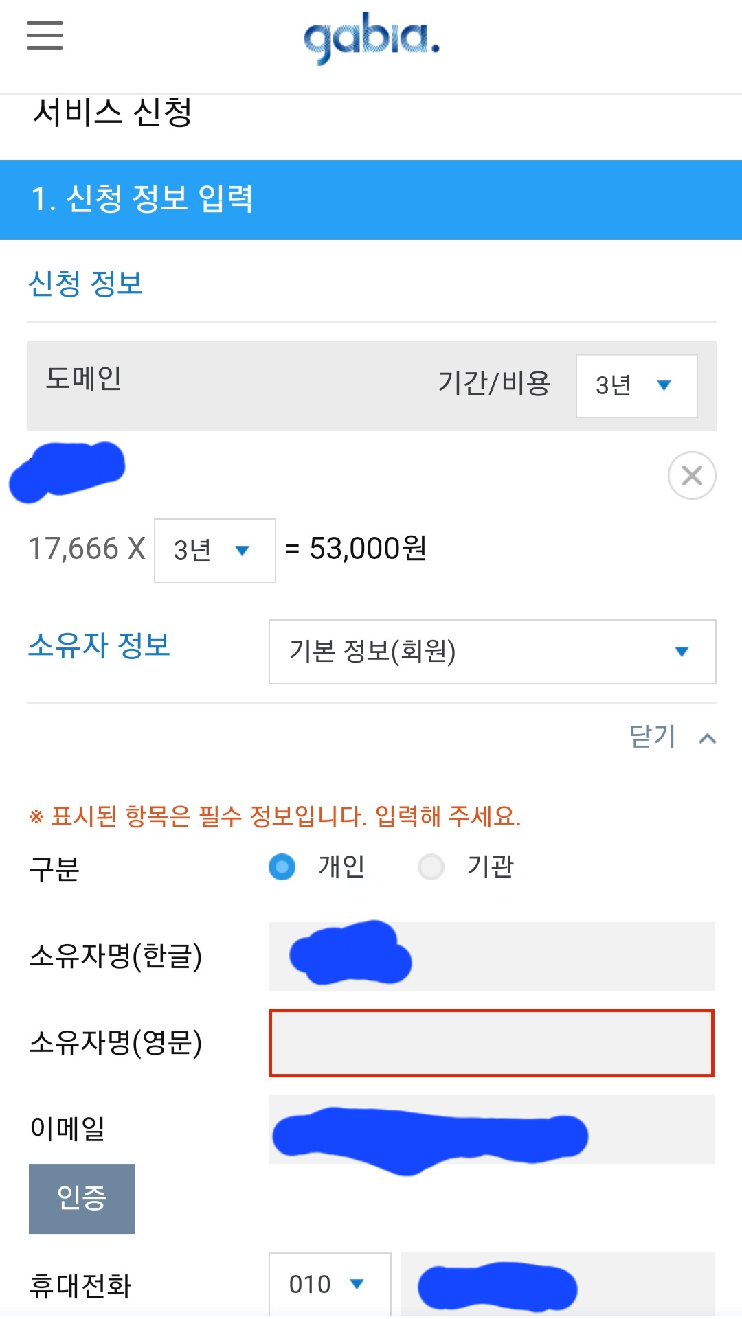 화면에서 1년 3년 5년을 고를 수 있으니 선택하고 금액을 확인 합니다. 신청정보는 다 채워넣어야 하니(빠지면 처음부터 다시 해야해서 전 여러번 다시 썼습니다). 이메일과 전화번호 인증은 필수 이니 이메일창을 켜놓으면 좀 더 빠르게 완료할 수 있습니다.