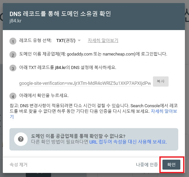 2) 입력한 도메인에 대한 소유권 확인을 하라는 창이 뜬다. 1 2 3 4번 내용을 확인 하고 3번에 있는 TXT 레코드를 복사합니다. 내 도메인은 가비아에서 생성 했기 때문에 DNS설정에 아래 TXT레코드를 넣을 예정이다.
