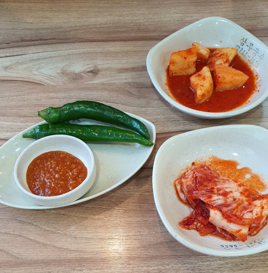 8시 땡 하자마자 들어갔기 때문에 손님은 우리밖에 없었다. 자리에 앉아서 고기국수, 비빔국수, 메밀만두를 주문 하니 밑반찬이 나오는데 반찬은 김치, 깍두기, 고추와 쌈장이다.