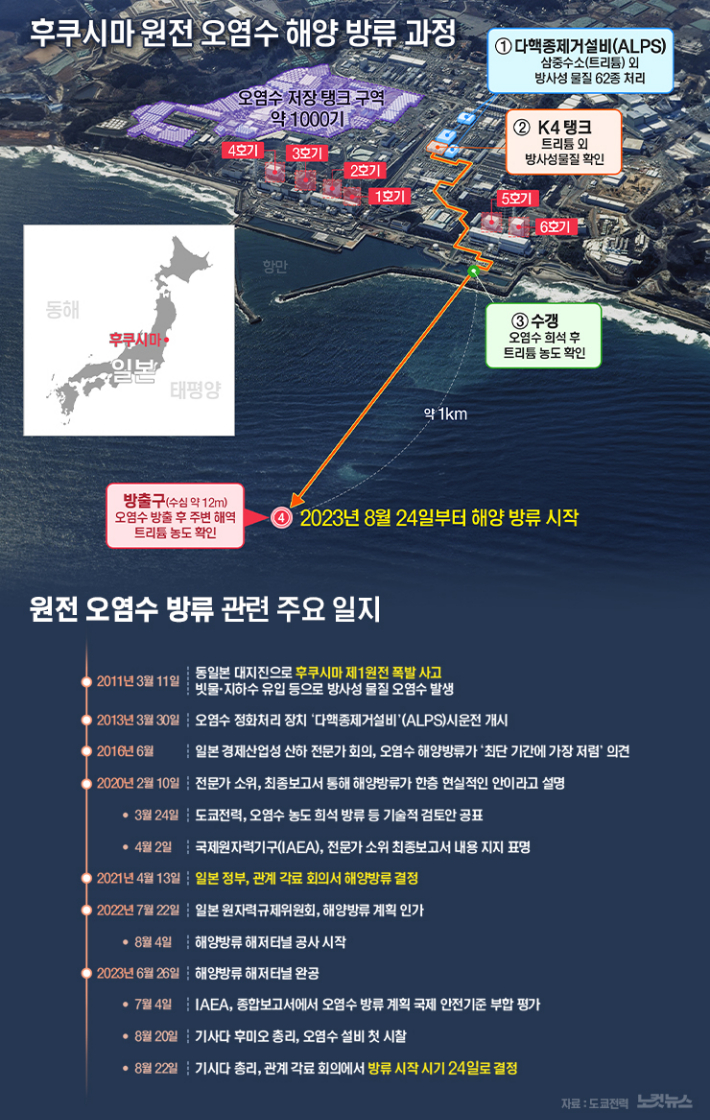 원전 운영사인 도쿄전력은 올여름 오염수를 다핵종제거설비(ALPS)를 거쳐 수중 트라이튬(삼중수소) 농도를 국가 기준치의 40분의 1(1리터당 1500베크렐㏃ 미만) 수준까지 떨어뜨린 다음 해저터널로 원전 앞 1㎞ 해역에 흘려보낼 계획이라고 예고했습니다.