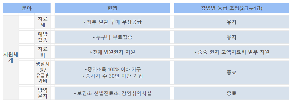 코로나19의 감염병 등급이 지난해 4월 1급에서 2급으로 하향 조정 된 후 1년 4개월 만에 4급으로 하향 조정된다. 감염병 등급은 4급으로 낮아지지만 위기단계는 '경계' 상태로 유지되며 중수본과 중앙방역대책본부(방대본) 중심의 정부 대응체계도 계속된다.