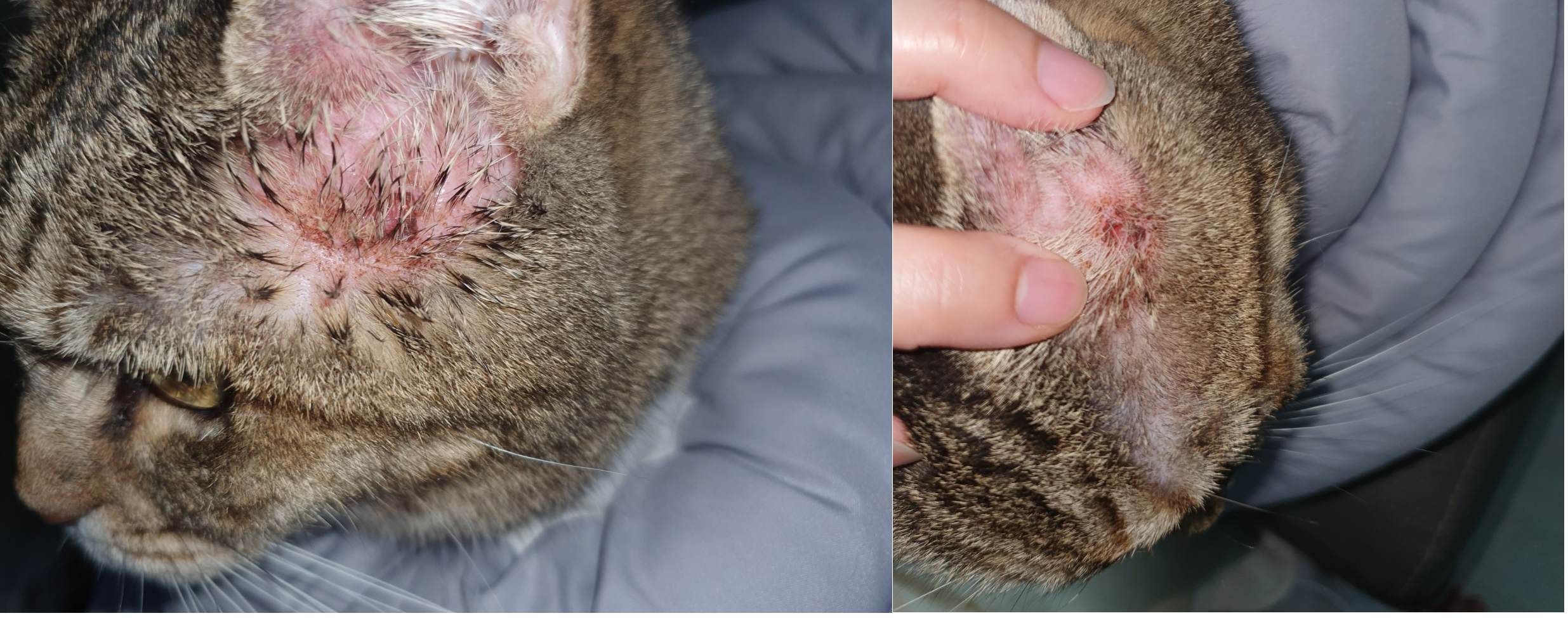 고양이세수 씨게 하고 뒷발로 긁어대더니 결국 상처가 났다.