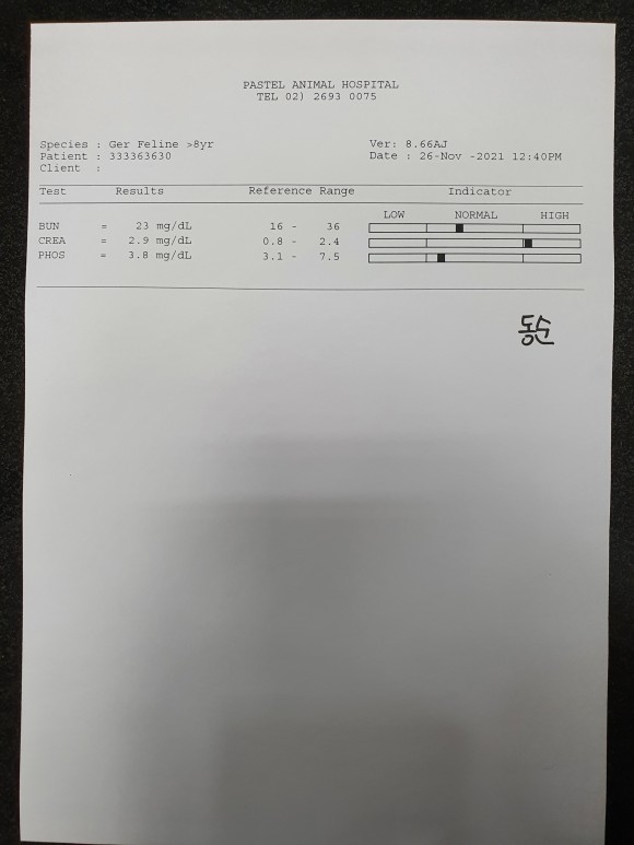 검사 결과는 크레아틴 수치 2.8, SDMA 수치는 기억이 안나는데 다음 21년 11월 26일 검사 했을 때가 SDMA20이 나왔다.