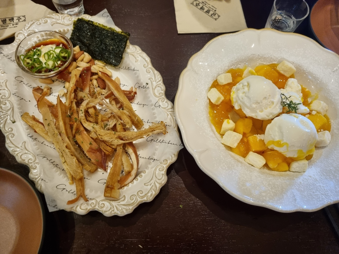 오른쪽은 교정중인 날 위한 안주란다ㅋㅋㅋ 아이스크림하고 치즈랑 망고랑 음청 맛있었다는..