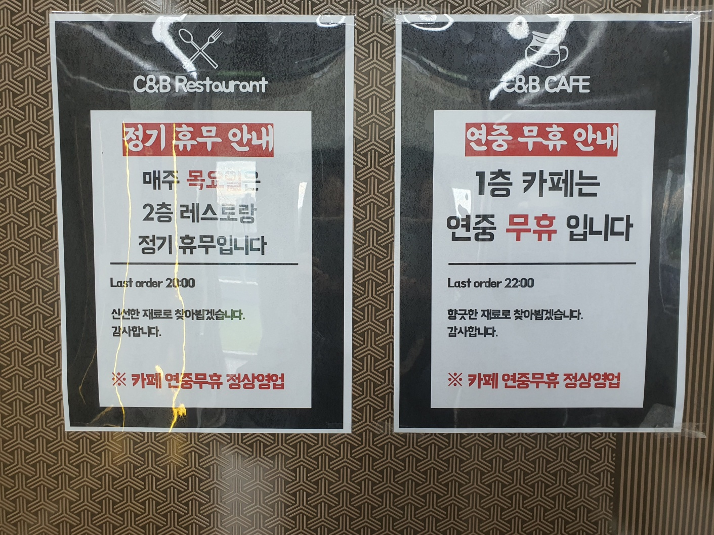 베이커리카페는 연중 무휴이고 카페는 매주 목요일 정기휴무이다.