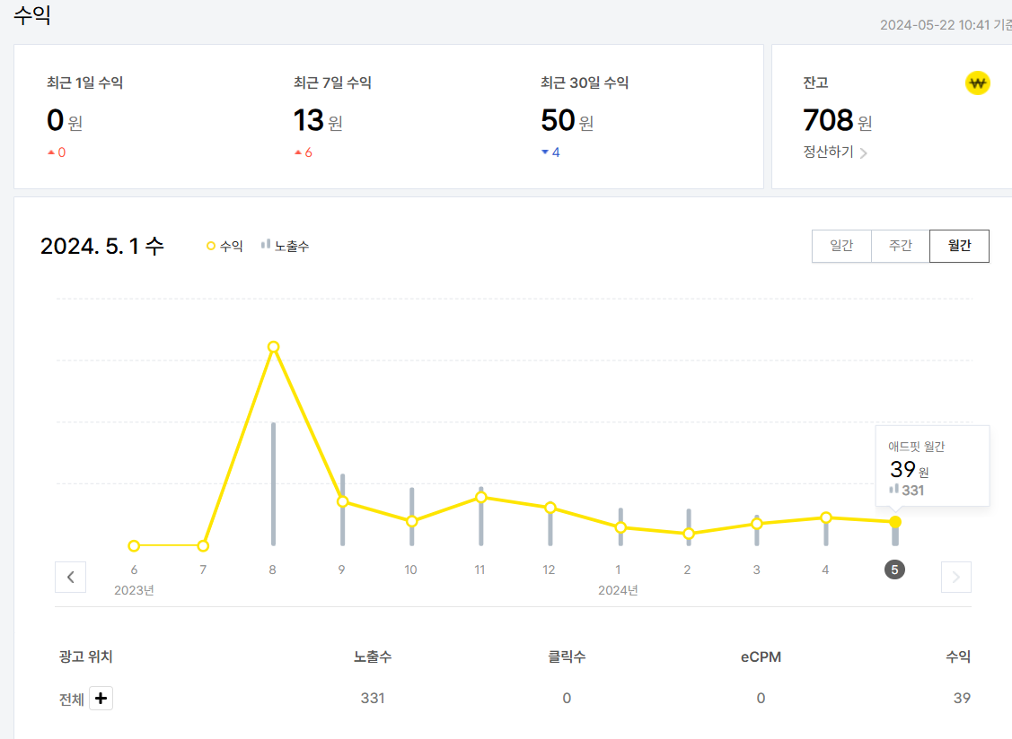 티스토리 자체 운영으로 인해 광고 수익은 이제 망했다 하기 막 직전에 티스토리와 애드센스를 시작했다. 난 진짜 왜 맨날 막차만 타는건지!!!!!ㅋㅋㅋㅋ