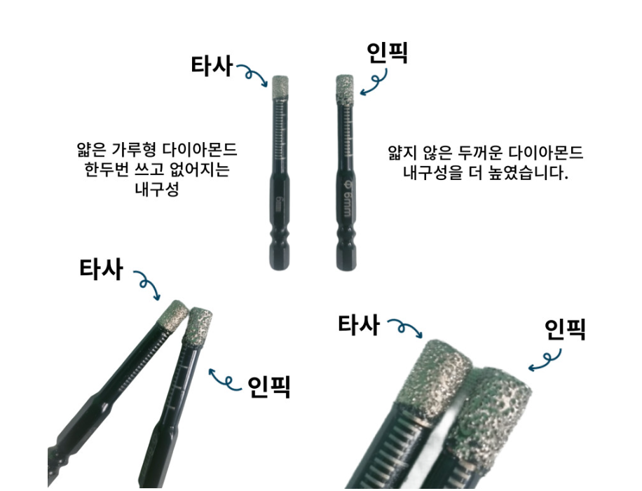 인픽 드릴비트는 타사 제품과 비교하여 다이아몬드 가루 크기부터가 다르기 때문에 높은