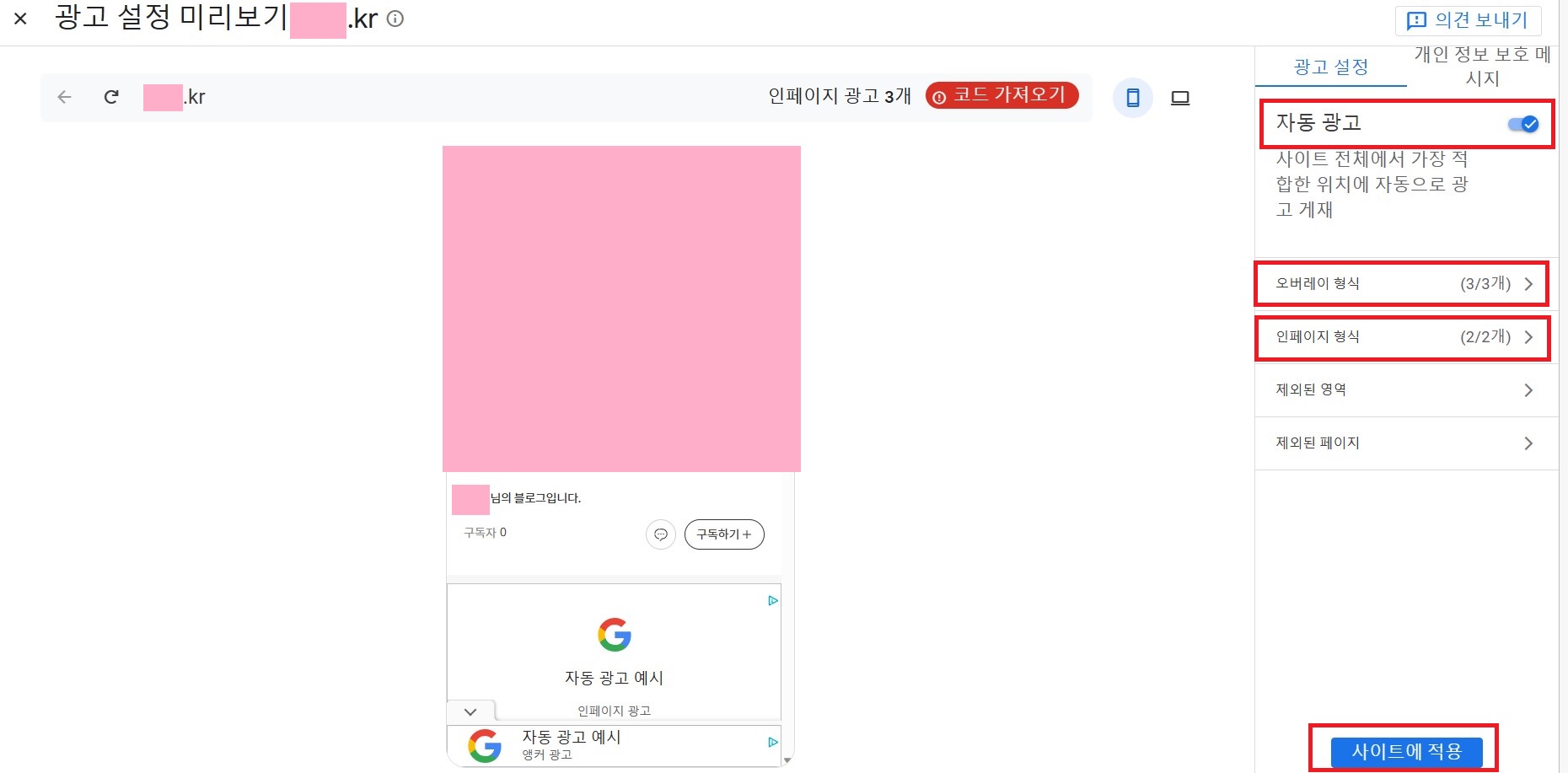 4.2. 두번째 탐색을 누르면 광고설정 미리보기로 가는데 내 도메인 검색이 완료 되어 화면에 나오면 자동광고를 키고 사이트에 적용을 누릅니다.