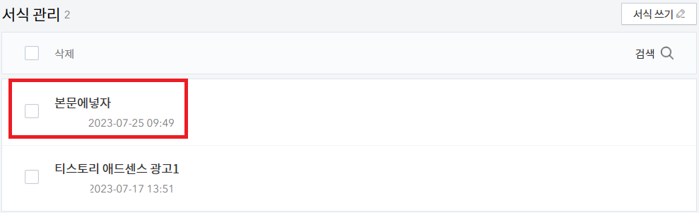 5. 티스토리 블로그 관리로 와서 서식관리 -> 서식쓰기 순으로 클릭 하고 아까 메모장에 복사해둔 본 본문에 넣자를 붙여넣기 한 후에 완료를 눌러줍니다. 완료 후 서식관리에 저장한 서식이 보이면 이 단계는 완료된 것이다.