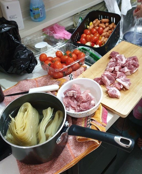 닭이랑 돼지 목살, 새우, 쏘세지, 방울토마토, 양파, 파, 파프리카를 사오더니 소스까지 직접 만들었다. 생전 주방 근처에도 안오고 앉아서 "물", "마실거" 이러던 늠이 소스 만들고 있으니 신기하더군. 물론 재료 씻고 준비하는건 내가 했다.