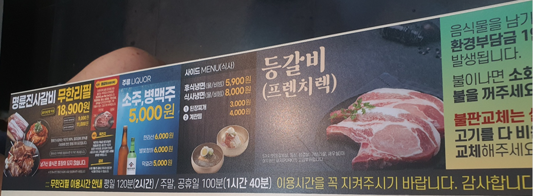 나는 저 음료 밑에 붙어 있던 "불판 교체는 셀프입니다!" 라는 걸 못보고 계속 불판을 바꿔 달라 했는데 별 말 없이 다 교체 해 주시고 마지막에 주인인 것 같은 아저씨가 불판 교체 하면서 원래는 셀프라고 말해 주셔서 알았다.