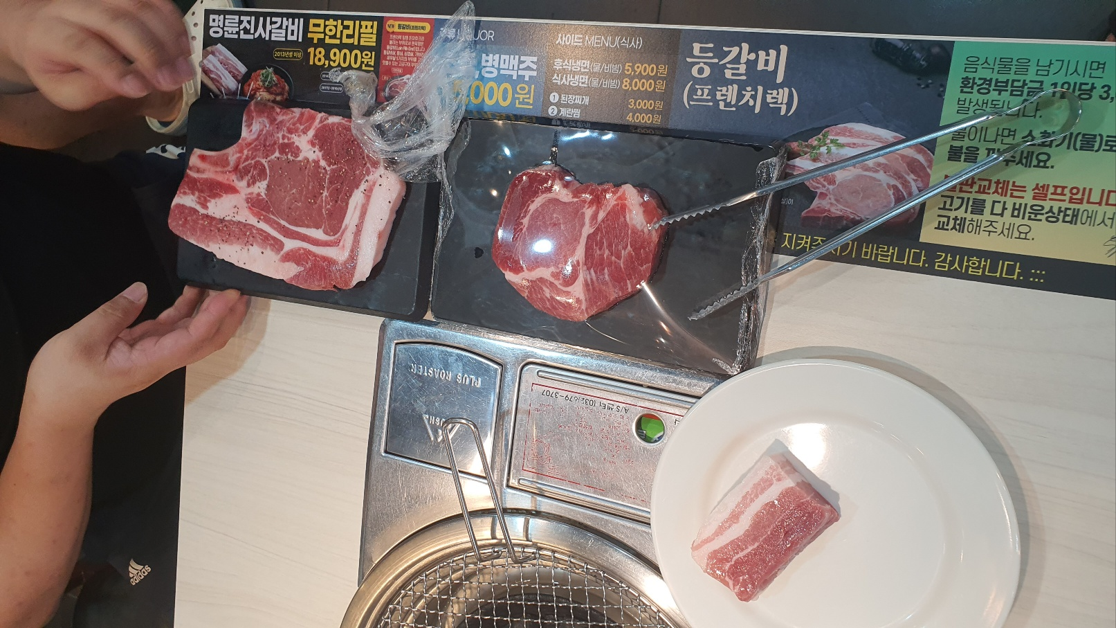 들어가서 보니 뭐가 많이 바뀌긴 한것 같은데 하도 간지가 오래되서 기억이 잘 안나서 그런지 그닥 감흥은 없었다. 뷔페처럼 스낵류들이 차려져 있었는데 모닝빵 하나만 챙기고 다른 튀김, 잡채 등은 손은 안댔다. 잡채를 퍼가긴 했는데 손도 안내고 다 남긴... 이럴거면 음식 아깝게 담질 말걸 그랬다. 무한리필집에 갔으면 고기만 먹어야지 사이드는 먹어봐야 돈이 아깝다는 주의라 앉자마자 기본 찬들 셋팅을 하고 고기부터 가져왔다.