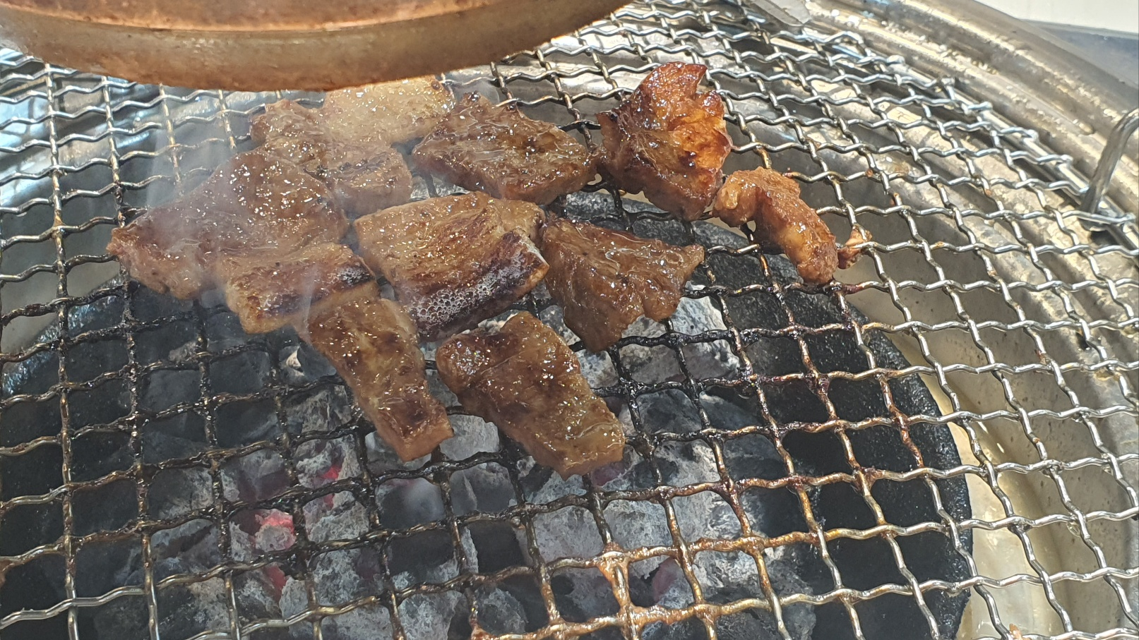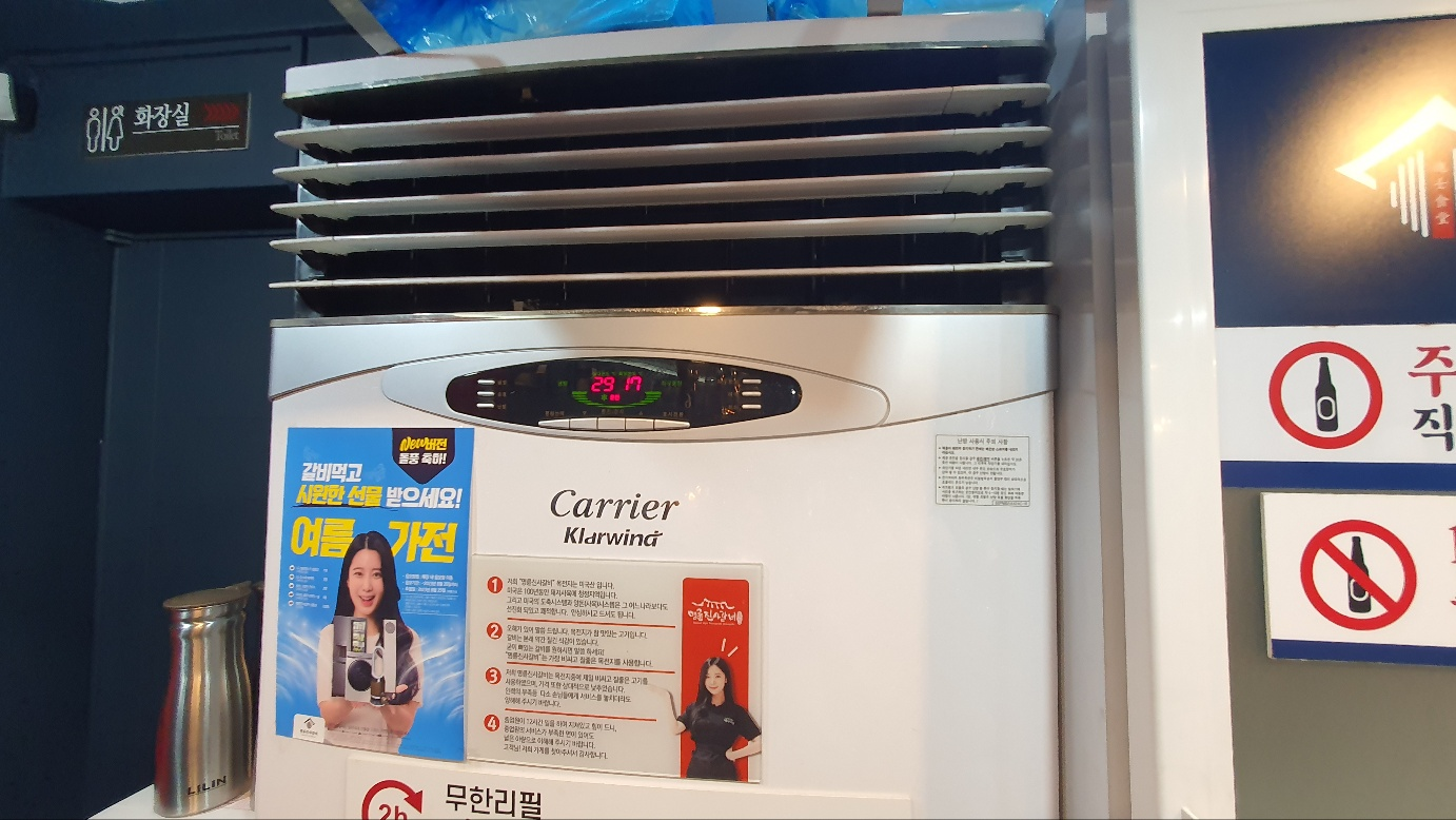 사실 고기는 대체적으로 맛있었고 화력만 좋았다면 더 먹을 수도 있었을 것 같은데 사람 미치게 하는건 여기 지점 매장 온도가 밖 온도랑 비슷했다. 사람 꽉 찼을 때가 32도, 우리 나갈 때 즈음 사람 좀 빠지니 29도인데 이 큰 매장에 에어컨이 두 개 밖에 없었고 이마저도 낡아서그런가 희망온도가 17도인데 실내온도가 29도였다.