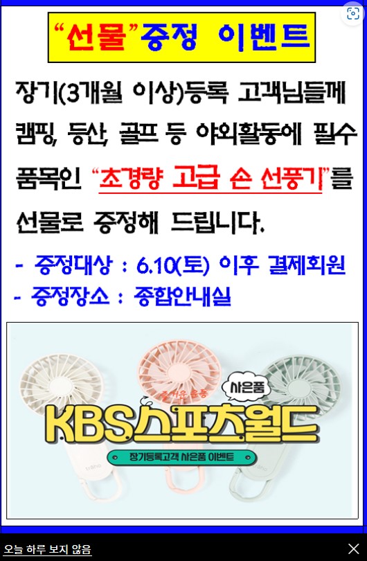 신규 등록하면 KBS 스포츠월드가 프린트된 스포츠 가방을 주는데 나는 월수금 7시 수업이라 회사 퇴근하자마자 바로 가야 하기 때문에 이 가방을 들고 출퇴근 중이다ㅋㅋㅋㅋㅋ 직원들이 놀리긴 하는데 뭐 어때 나만 편하면 됐지뭐ㅋㅋ