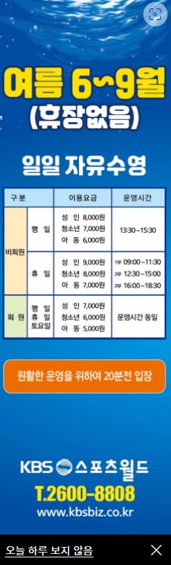 구민센터는 신규 등록이 어려운 반면에 등록만 하면 수강일 외에 자유수영이 가능했는데 KSB스포츠월드는 추가금을 내고 꼭 내가 강습받는 시간에만 화목 자유수영이 가능했다. 실제로 자유수영 하러 가면 감시(?) 하는 사람이 있어서 수영장 안에서 이름이 뭔지 등록확인을 꼭 한다는거...