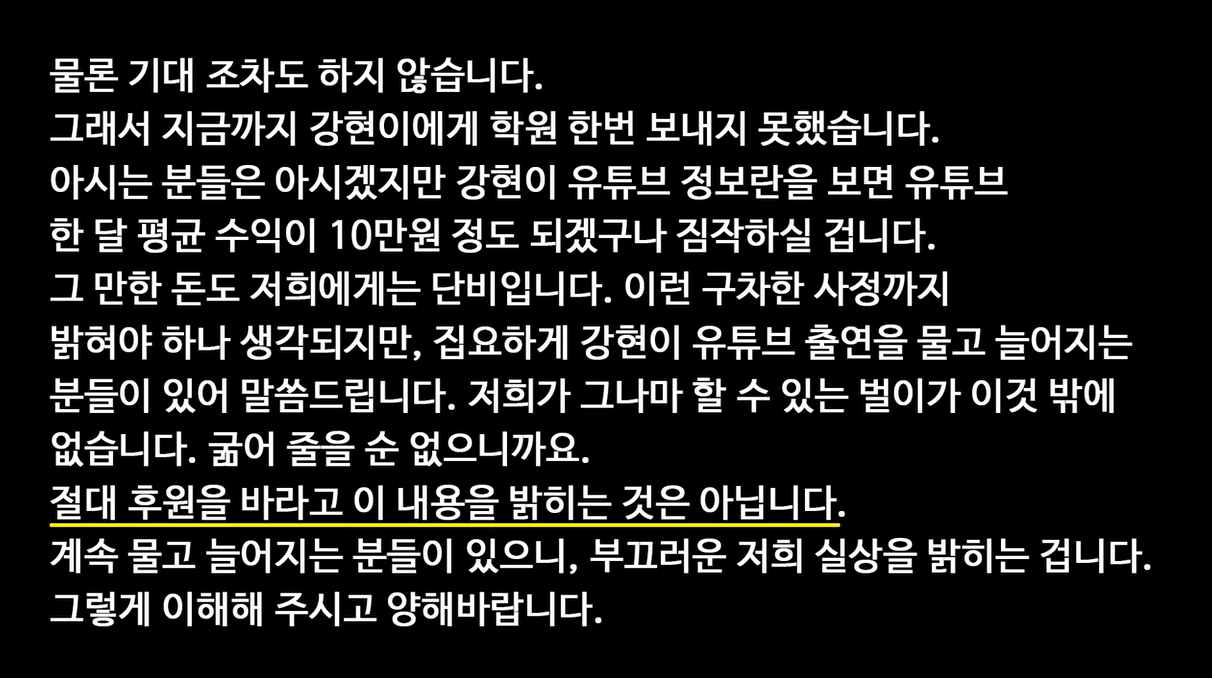백군의 아버지는 아이를 돈벌이에 이용하지 마라, 강현이가 똑똑한 건 알지만, 여기있는 모든 아이가 강현이 만큼 특별한 재능을 가지고 있다' 등의 메일을 주기적으로 받아왔다고 밝히며 유튜브를 계속 할 수밖에 없는 현재 강현군 가족의 사정에 대해 이야기 하였다.