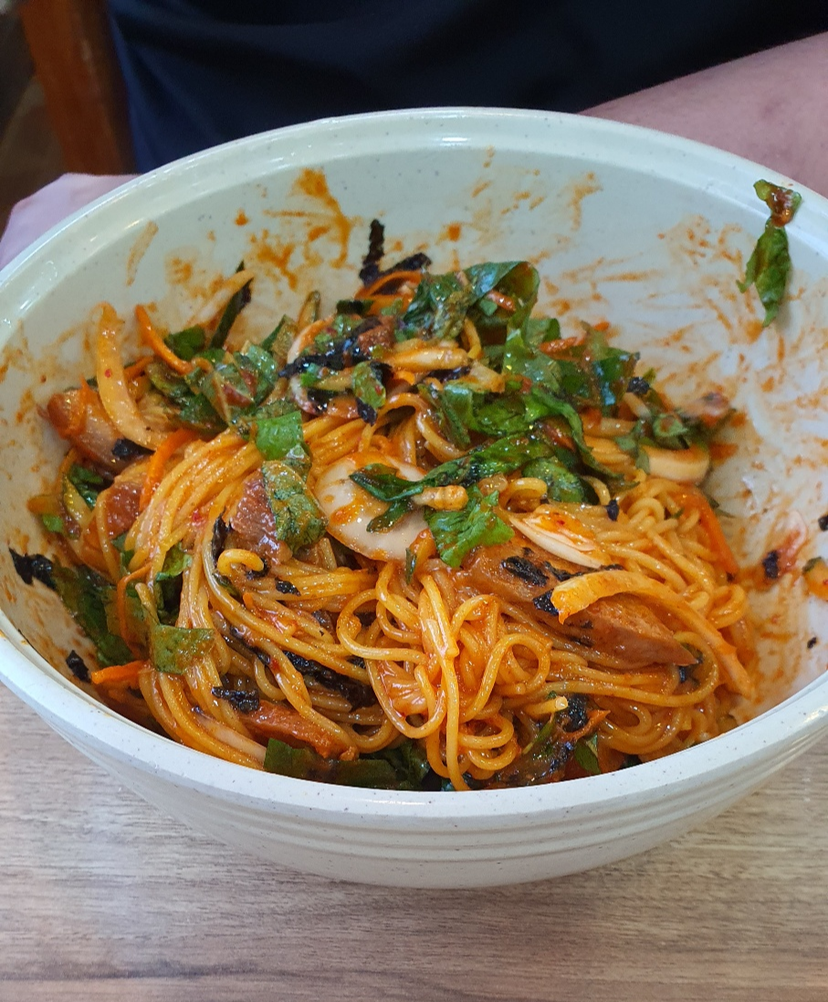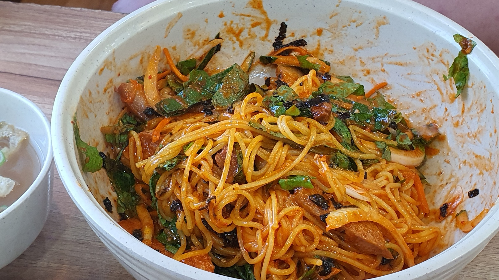 비빔국수는 갓 나왔을 때 찍었어야 하는데!!!! 잠깐 한눈판 사이 오빠가 비벼놔서.... ㅠㅠ 살짝 한입 맛보았는데 새콤한게 맛있는기는 했지만 내 취향은 고기국수가 더 맞는 것 같다.