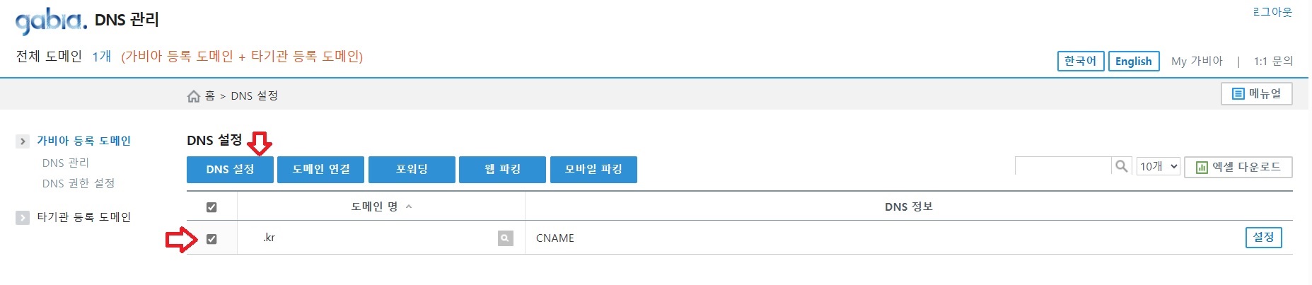 4. DNS관리 페이지로 들어가면 아래 페이지가 뜰텐데 내 도메인 주소 옆에 체크 선택을 하면 바로 위에 도메인 연결을 할 수 있게 불이 들어옵니다. 체크 해제 된 상태로는 상단 파란색 메뉴옵션들은 클릭이 안되니 꼭 클릭한 후에 도메인 연결을 눌러야 합니다.