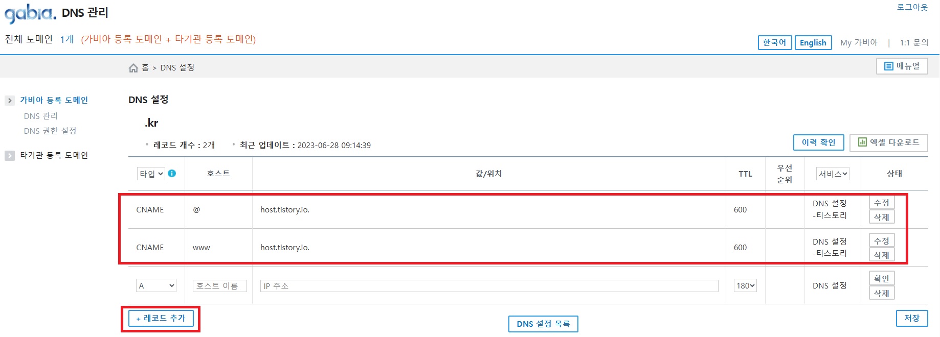 티스토리 개인 도메인 연결-2(가비아 DNS 등록 설정)
