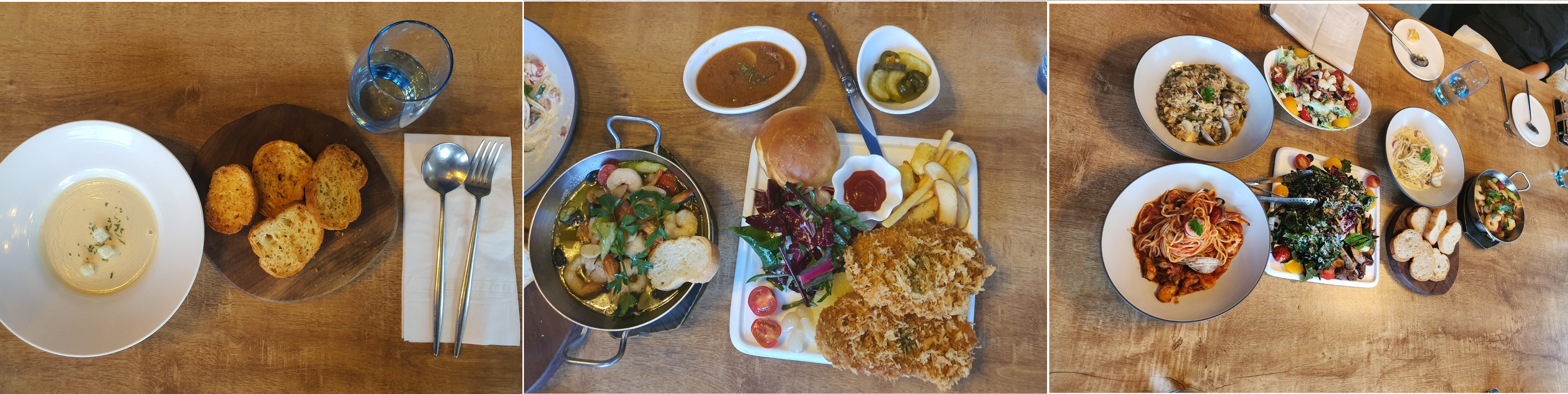 사실 어린것들 1에 해당하는 나는 메뉴를 구경도 못했다. 으르신들이 얘기하고 결정 하셔서 다 주문하고 난 후에 메뉴판 한번 보여달라고 한정도?ㅋㅋ 처음에 스프와 빵이 나오고 크림파스타, 토마토파스타, 감바스, 리조또, 스테이크샐러드, 돈까스, 시저샐러드가 나왔고 다 같이 쉐어해서 먹었다.