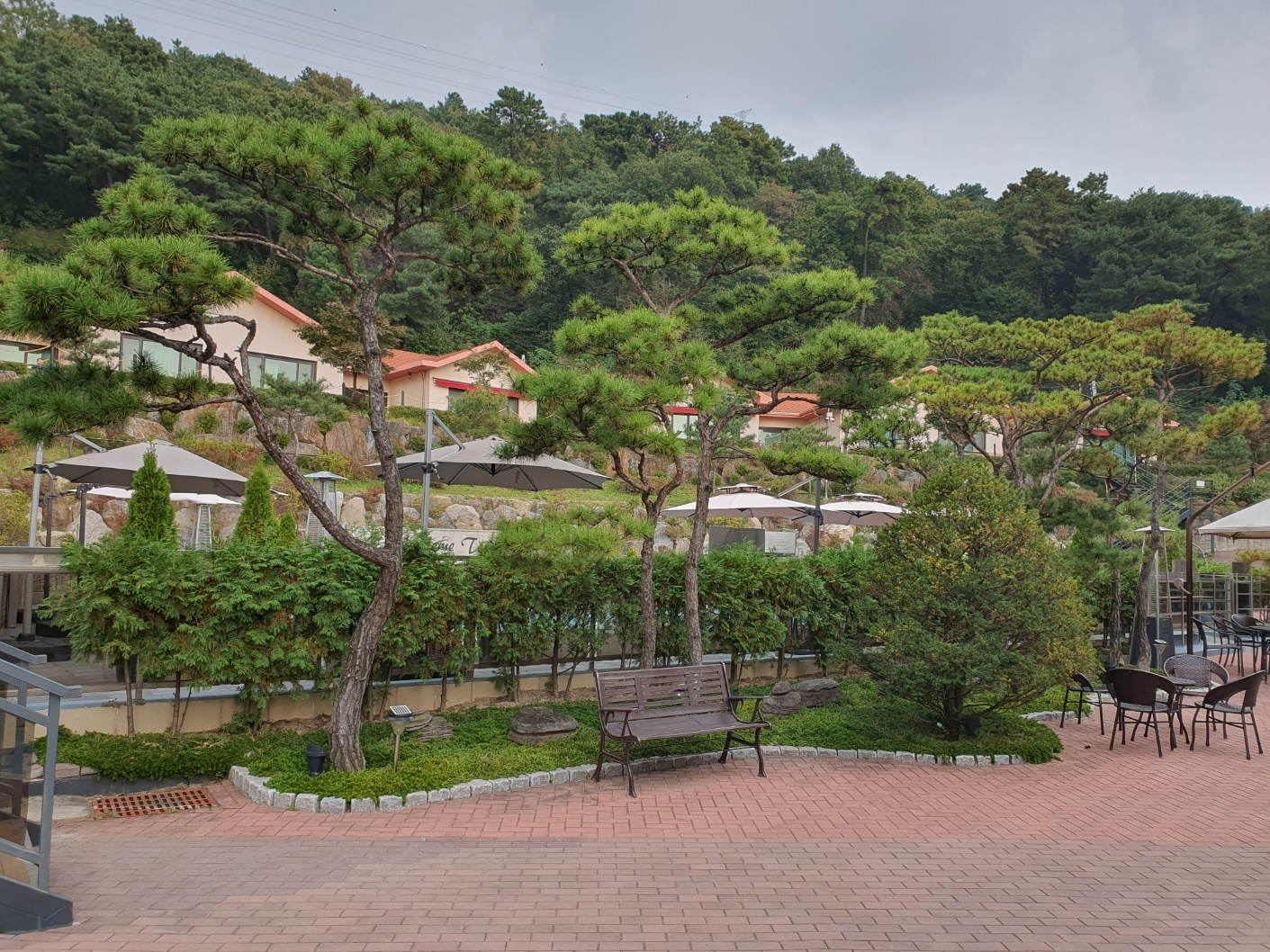 문을 열고 들어가면 왼편으로 작은 거실이 있고 커텐을 치우면 밖에 전경이 한눈에 들어온다. 사진에 보이는 건물들이 다 객실이다.